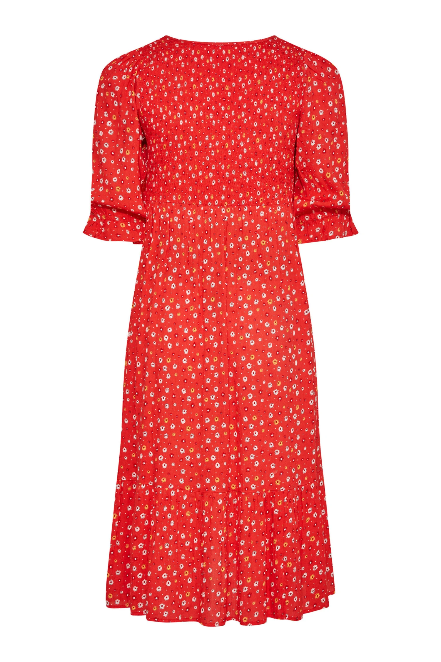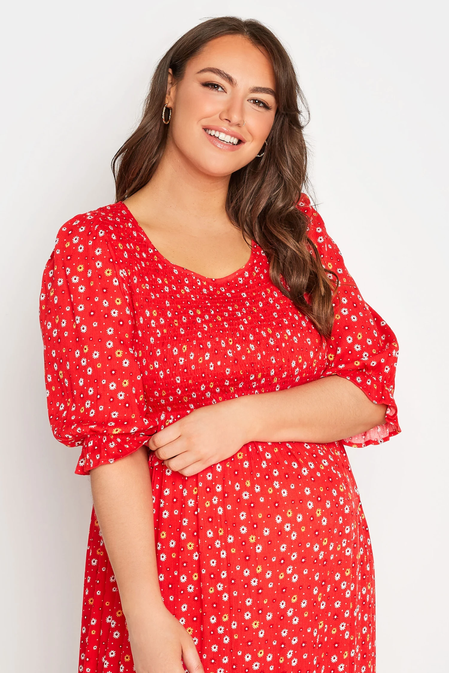 Add this ditsy print dress to your summer collection. Made from a soft knit fabric, it features 3/4 length sleeves, shirred upper fabric, a scoop neckline and is complete at a midi length providing you with both style and comfort. Pair with trainers for a casual look.