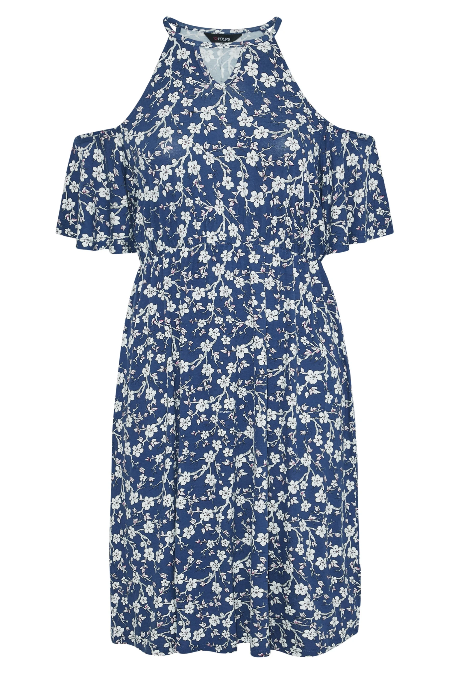YOURS Curve Blue Floral Cold Shoulder Dress