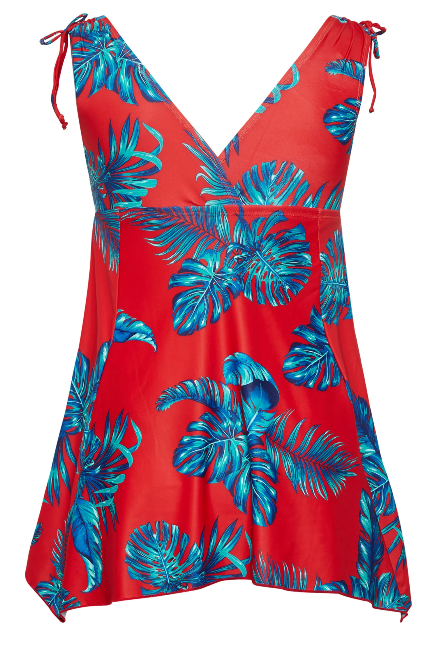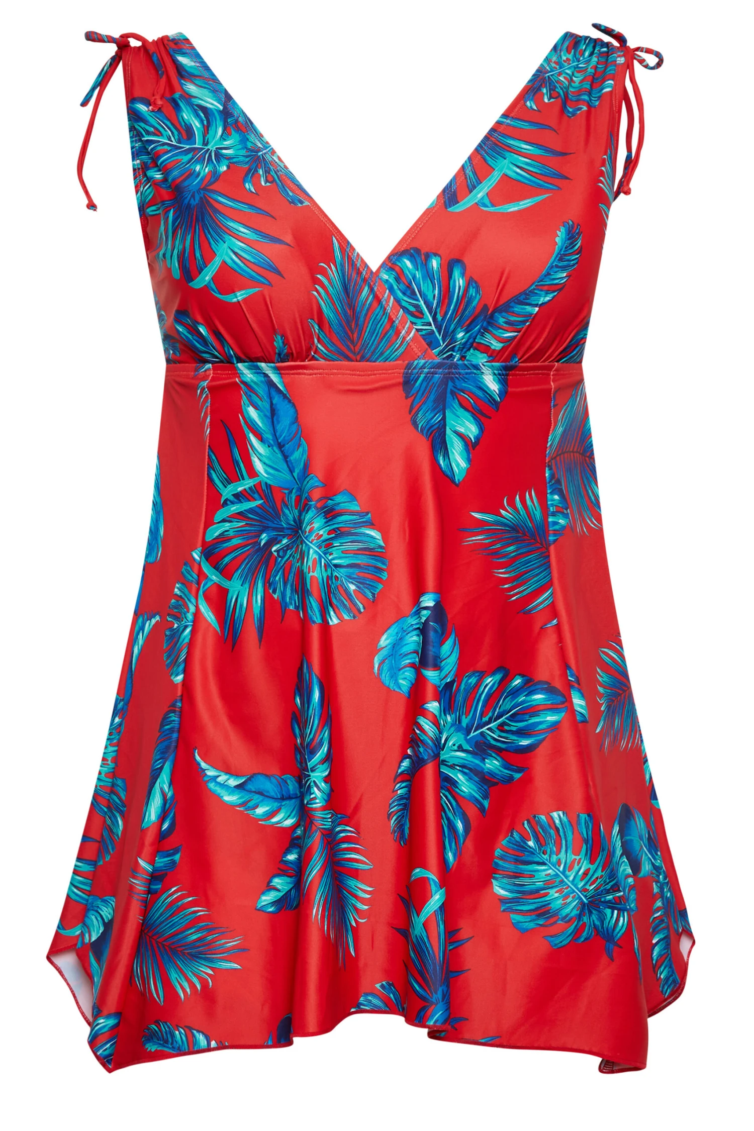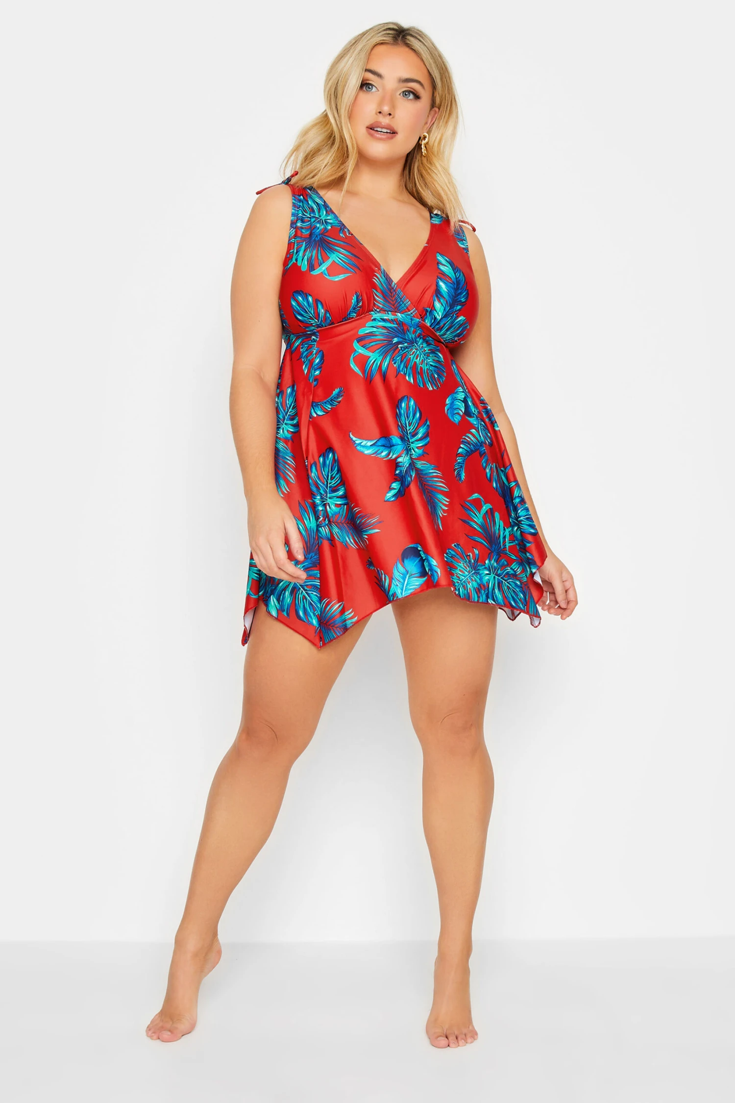 YOURS Curve Red Palm Leaf Plunge Tummy Control Swim Dress